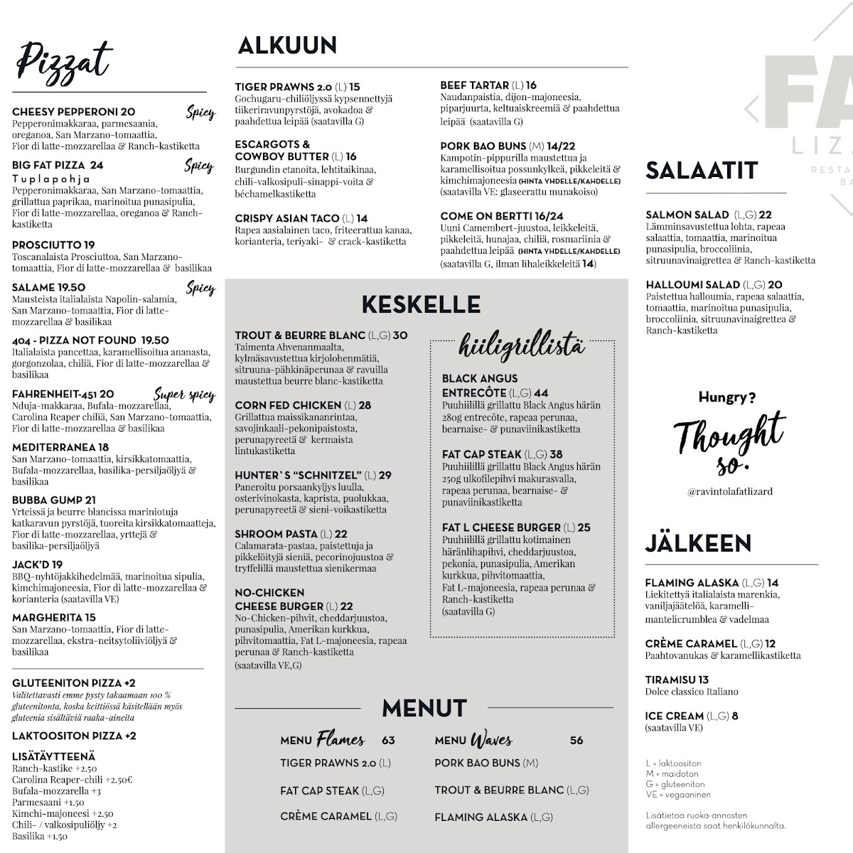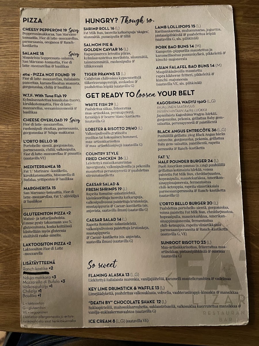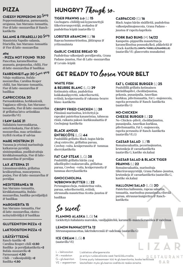Welcome to Restaurant Fat Lizard City, a vibrant culinary haven located in the heart of Helsinki at Mannerheimintie 3. Celebrated for its delectable oven-baked pizzas, this cozy establishment also invites you to explore a variety of options including juicy burgers and tempting desserts. Patrons rave about the friendly service and the inviting atmosphere, perfect for an enjoyable evening with friends.
